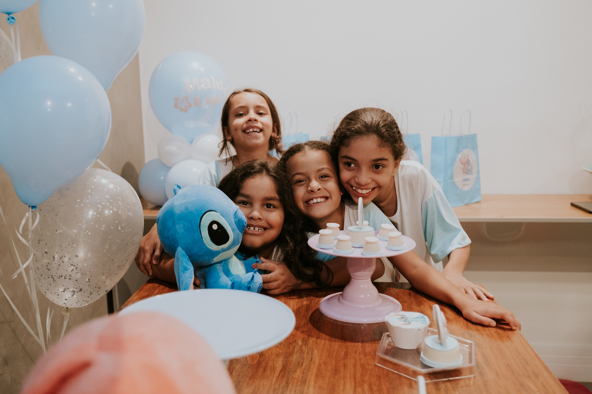 As pequenas convidadas chegaram de pijama, prontas para viver uma aventura digna da Lilo e do Stitch. Teve sessão de danças na sala com direito à pastel, cabana com cobertores e bandeirinhas do Lilo & Stitch. Entre risadas, brincadeiras e histórias sussurradas antes de dormir, a energia era pura alegria — aquela mistura deliciosa de infância, imaginação e amizade sincera.